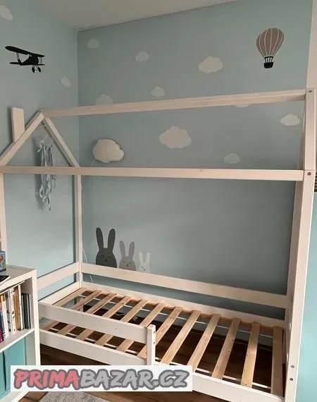 Po jednom dítěti, viditelné vady viz foto. Je vyrobená z borovicoveho dřeva. Proto jsou vidět suky. Má zaoblené hrany. Postel obsahuje bezpečnostní zábranu a dřevěný rošt.
