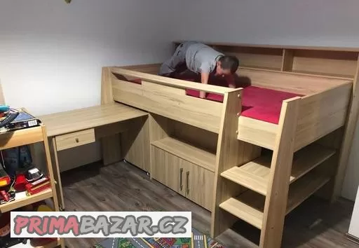 Prodam dětskou patrovou postel, bez matrace. Rozměr matrace 90x200. Jedno menší poskozeni viz.foto. Součástí ke skříň a vyřazovací psací stul.