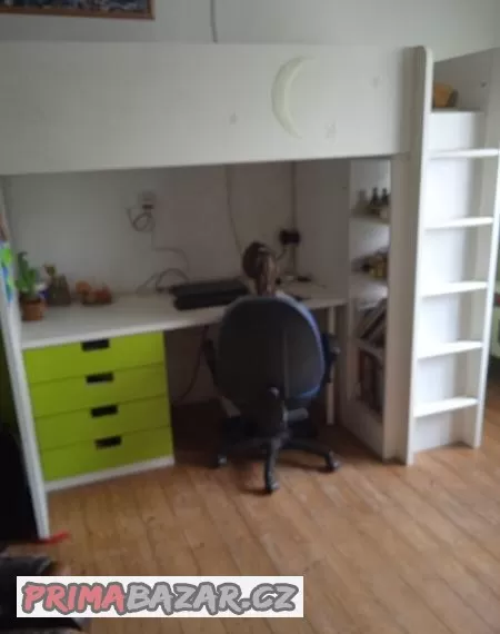 Prodám dětskou patrovou postel z psacím stolkem ,zšuflaty, poličky, z vystavěnou skříní a samostatnou skříní. Madračka rozměr 90x200 cm. S kvalitního materialu.