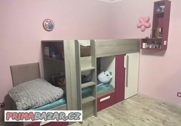 patrová postel s velkou šatní skříní a hlubokými šuplíky, prostor mezi lůžky 76 cm, skříň i schůdky jsou variabilní, možné zrcadlové sestavení, patrová postel s rošty v podobě větraných desek, bez matrací. Matrace 2x, cena ks 2500,-Kč , španělský výrobce nábytku s certifikací.
