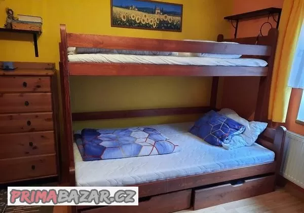 Prodám patrovou postel, masiv borovice, vrchní 90x200cm, spodní 120x200cm,, rošty (spodní laťkový,vrchní lamelový) v ceně, žebřík možno umístit vlevo nebo vpravo, v ceně šuplíky.