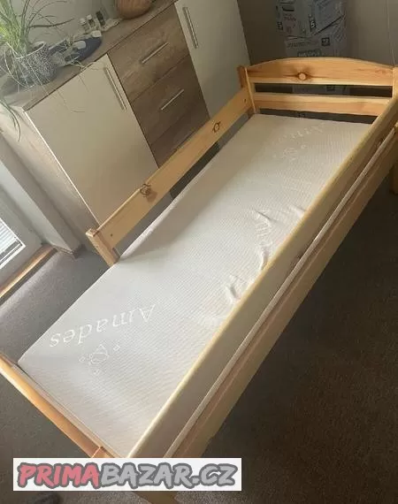 Velice pěkná postel, včetně matrace. Má jednoduchý laťkový rošt. Zábrana (bočnice) lze dát na libovolnou stranu.