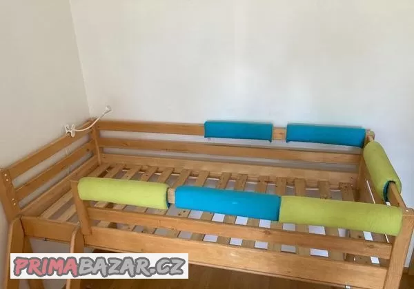 Prodám dětskou postel Domestav. Spodní nohy jdou oddělat. Možnost i jako nižší postel. Matrace 85x195cm. Rozměr postele výška 120cm,délka 210 cm, šířka 100 (bez žebříku). Prodávám bez postranních polštářků na okraji postele.