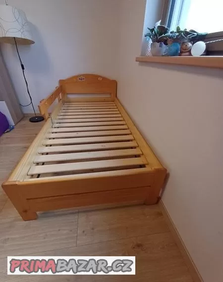 Dobrý den, nabízím dětskou postel 90x200 cm, masiv smrk z truhlářství,včetně roštu a zábrany-ta je odjímatelná, bez matrace. Je nižší-junior. V perfektním stavu, po 1 dítěti.