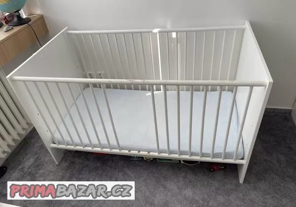 140 x 70 cm. Postel je polohovací na 3 způsoby - viz foto dírek pro uchycení. Součástí je kokosová matrace pro miminka. Byla celou dobu pokryta voděodolným prostěradlem proti promočení !!! Až bude dítě větší, 3 šprušle se dají vyjmout, aby dítě mohlo samo vylézt z postele. Nálepky z čela postele už byly odstraněny a odběr v demontu, přešli jsme na patrovou pro 2 děti.