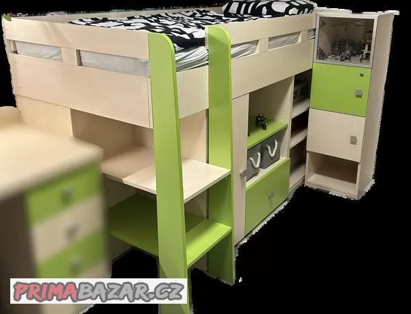 Prodám vyvýšenou postel se sestavou skříněk, rozměr postele: 90x200, včetně matrace tloušťky 16 cm a roštu. Provedení z lamino desek viz. foto. K dispozici dva kusy této kompletní sestavy. k opětovnému sestavená bude nutná částečná montáž.