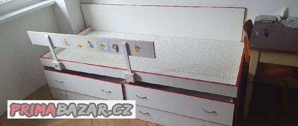 Na zakázku dělaná dětská postel s čtyřmi úložnými šuplíky a zábranou proti pádu.