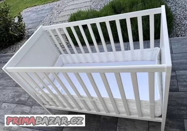 Dětská postýlka IKEA SUNDVIK 60 x 120 cm s matrací, potahem a vložkou. Postel je možné polohovat i pro kojence, či sundat bok, vložit vyměnitelný díl a postýlku nechat na jedné straně otevřenou. Na laku jsou oděrky, textilní části čisté. Prodávám jako kompletní set.