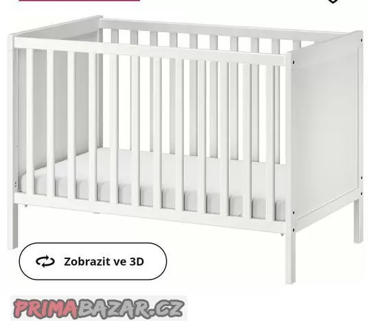 Málo používaná postýlka, včetně ozdobného látkového pásu, s matrací, druhá bočnice je součástí postýlky.