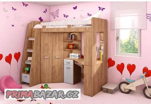 K prodeji patrová postel s integrovanou rohovou skříní a psacím stolem včetně matrace s rozměry: VxŠxH: 190 x 204 x 120 cm, plocha na spaní: 80 x 200 cm. Odstín dub sonoma/bílá. Používána jeden rok, drobné poškození cca.5mm na dvířkách.