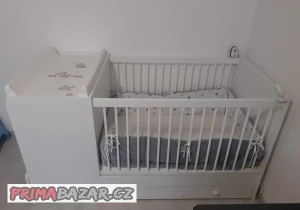 Prodám rostouci dětskou postýlku.Dětská postýlka Klups Kompakt má dvě výškové polohy a tři vytahovací šprušle. Po rozložení vznikne postel se šuplíkem a komoda, která může sloužit zároveň jako přebalovací pult. Jelikož má postýlka atipické rozměry je matrace nastavena kusem molitanu(vyfoceno), ničemu nevadí. Dvě praskliny na komodě(vyfoceno) od utahování šroubů a v šuplíku mapy od vody, jinak bez vad a v perfektnim stavu. V ceně přebalovací podložka a matrace. Odvoz vlastní, po domluvě lze dovézt.
