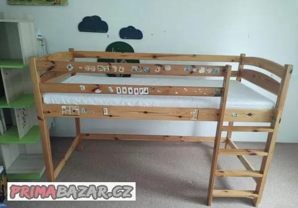 Prodám použitou vyvýšenou postel, která je stále v dobrém stavu. Mat.: Borovice, celkové rozměry: délka-187 cm, šířka-87 cm, výška 122 cm. Prostor pod postelí lze využít k hraní - vhodné do menšího pokojíčku. K posteli nabízím i matraci - použitá (není v ceně). Spíše jako "první pomoc", než si zakoupíte novou podle vašich požadavků. Pouze osobní odběr v Nepomuku.