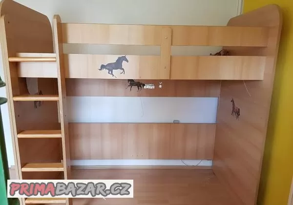 Dětská postel, spaní nahoře, příprava na spodní ležení. Boční čela jsou dost silná. Hrany na žebříku jsou místy odřené, nášlapy žebříku dělané ze dřeva, dřevotříska nevydržela. Čela šířka 106 výška 190 cm. Délka 205cm