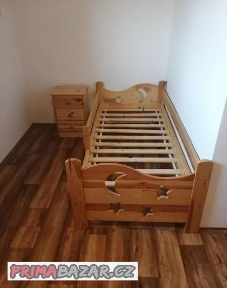 Prodám dětské postele z masivního borovicového dřeva včetně roštu (po domluvě lze přenechat i matrace). K jedné z postelí je i úložný prostor (velký šuplík). Celková šířka 91 cm, celková výška 61 cm, celková délka 185 cm. Velikost matrace 180 x 80 cm. K posteli je i noční stolek (rovněž z masivního dřeva) – výška 58 cm, šířka 42 cm, hloubka 35 cm. Vše ve výborném stavu (nepoškozené). K dispozici jsou dva komplety (tzn. dvě stejné postele a dva noční stolky). Cena za komplet 2.000 Kč. Při rychlém jednání sleva. Více informací na telefonním čísle 773 682 829.
