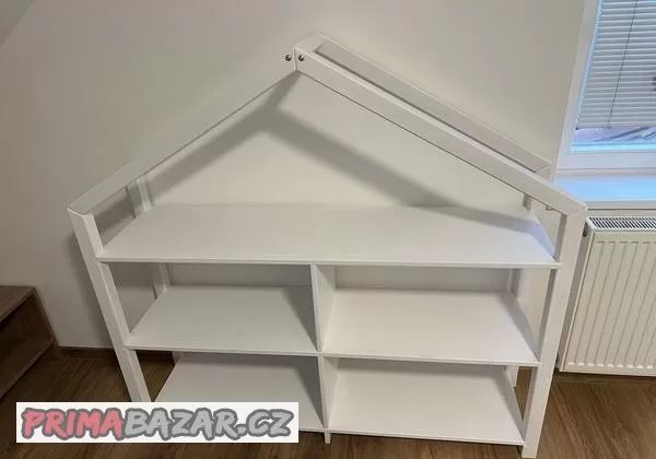 Prodám dětský domečkový regál ve velice slušném stavu až na drobné oděrky viz foto. - stačí přetřít nebo dát ke stěně obráceně (druhá strana je v pořádku)