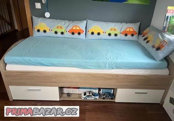 Prodám nábytek po synovi, postel s polštáři bez madrace, stojan na hračky s boxy ( bez zelených), zdarma k tomu stůl. Cena dohromady. Vlastní odvoz.