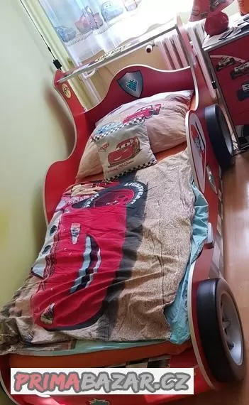 Prodám velmi krásný dětský pokoj pro malé závodníky/závodnice. Postel má rozměr 90x200 má světla a svítí. Set obsahuje ještě skříň, knihovnu, dětský stůl, komodu a zdarma přidám nástěnné hodiny, budík, lampu a lampičku na stůl a stylový koš a navrch ještě krásnou záclonu s auty Cars. Původní cena 62.000,-Kč - nyní 25.000 Kč. Při rychlém jednání přidám i krásné povlečení na postel s auty, které je na fotografii. Postel je bez matrace a nábytek je jako nový (drobné nedostatky po jednom dítěti).