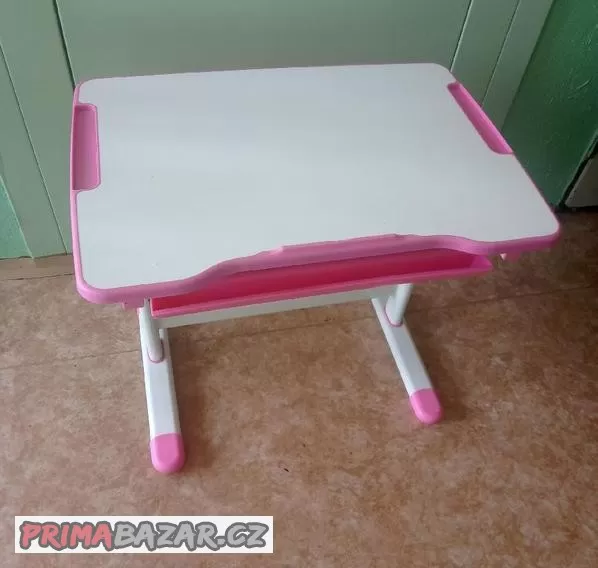 Dětský psací stůl AlzaErgo Table ETJ100 růžovýý - pro děti od 6 do 15 let. Desku stolu lze snadno a bez nářadí naklonit v rozmezí od 0° do 40°, upevní se pouze otočením kolečka. Pod deskou se nachází zásuvka s různě velkými přihrádkami pro uložení knih, papírů na kreslení či psacích potřeb. Veškeré plochy stolu jsou opatřeny antireflexní barvou, díky čemuž chrání dětské oči před oslněním nepříjemnými odlesky.Na boku je háček pro zavěšení tašky nebo batohu. Minimální výška stolu je 540, maximální 760 mm. Plocha desky je 664 x 474 mm. Stůl je plně funkční, v dobrém stavu, téměř nepoužívaný.