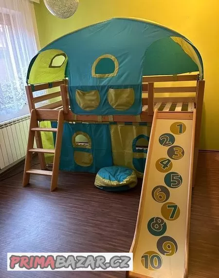 DOMESTAV sestava dětského pokojíčku, postel se skluzavkou, dole bunkr, rostoucí psací stůl, židle, box se šuplíkama,