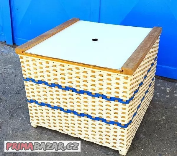 Dřevěný koš proplétaný plastovou bužírkou původně sloužil pro úschovu přezůvek.