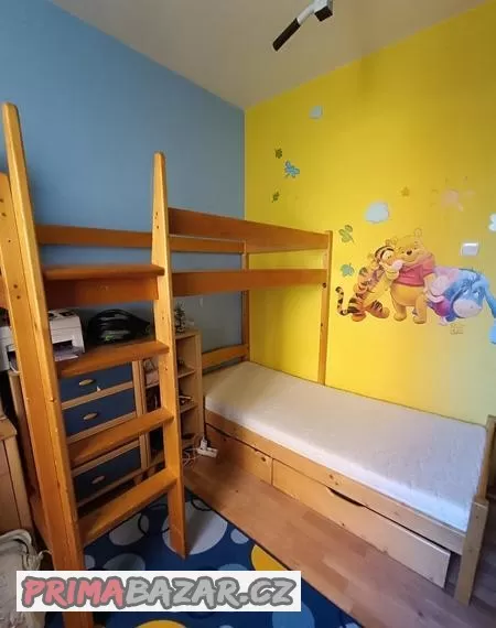 Dvoupatrová rohová postel+2 matrace DREVOČAL, včetně úložných šuplíků a roštů. Postel rozměr 198x198cm, matrace vel.190x80x15cm, (komoda není na prodej) Cena za všechno 3500,-kč. K vidění ve Vsetíně.