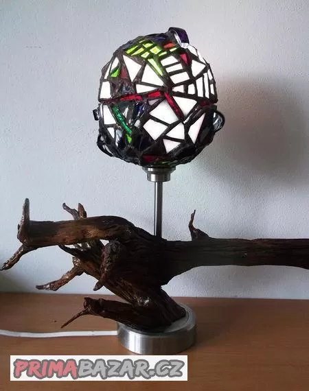 Lampa vyrobena technikou Tiffany z opalového skla, skla spectrum, skla UROBOROS, skleněných kabošonů ze sklárny Bělá pod Bezdězem. Samorost, respektive kořen borovice, od Máchova jezera. Lampová noha je vybroušena z nerezu. Uvnitř žárovka LED 35 W. Je možno vložit i silnější LED žárovku. Kabel bílý, patina bronz a měď.