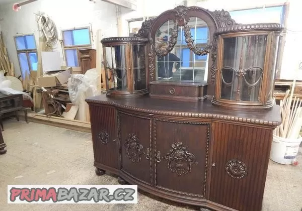 Prodám starožitný dubový masivní nábytek jídelní sestava: kredenc, skleník, rozkládací jídelní stůl, šest židlí