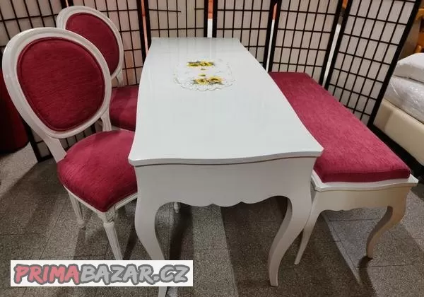 Nabízíme masivní jídelní set italské výroby, zhotoven na zakázku. Stůl měří 140x60 cm, výška 76 cm + 2 židle, rozměr sedu 40x49cm, výška opěrky zad 48cm, výška sedu 48cm + čalouněná lavice, rozměr sedu 120x45 cm, výška 56cm. Prohlédněte si naše další inzeráty.