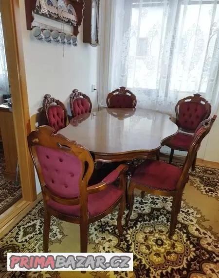 Dobrý den , prodám krásnou jídelní Italskou sestavu z masivu Anglický dub v tmavé barvě na stole jsou krásné reliefi s květinami a noha stolu je krásně vyřezávaná a zdobená . Sestava se skládá s jednoho velkého stolu a z dvou křesel a 4 židliček polstrovaných . Puvodní cena byla 70 tisíc kč ted dám za 28 tisíc kč nebo dohodou .