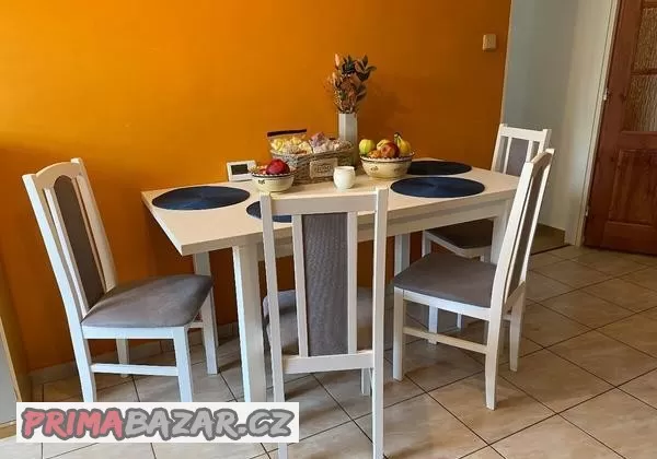 K prodeji rozkládací jídelní stůl Maxim a židle Bols. Koupené ve Sconto nábytek 05/22.