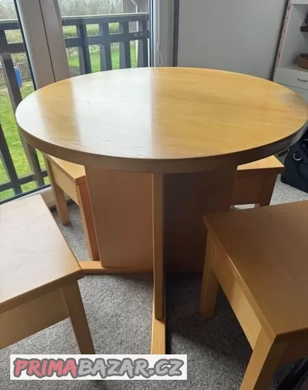 Prodáme masivní jídelní sestavu, která se skládá z kulatého jídelního stolu o průměru 80 cm a židlí 4 kusy.