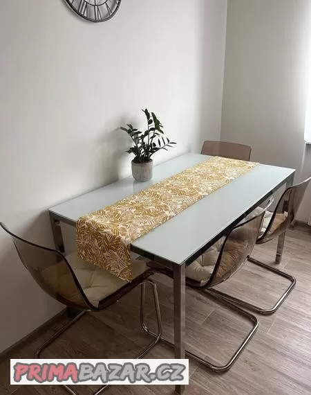 Prodám jídelní stůl se čtyřmi židlemi. Matné sklo, nerezová konstrukce, plastové židle. Žádné známky opotřebení. Rozměry: délka 135 cm, šířka 85 cm, výška 74 cm. Vlastní odvoz (3. Patro), cena za celý komplet. Uherský Brod.