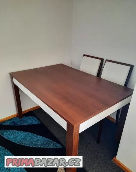 Nabízím k prodeji jídelní stůl + 6 židlí. Rozměr stolu v základu 90x136cm + 2x37cm rozložený na 173cm a 210cm, výška stolu 76cm. Materiál lamino. Jídelní židle 6 ks, bílá barva, na některých kusech popraskané sedáky. Běžné používání.