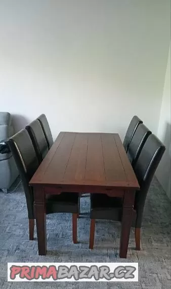Jídelní stůl s rozměry 180x90x76. V pěkném stavu bez poškození. K tomu 6 židlí, které mají drobné oděrky. Pouze osobní odběr.