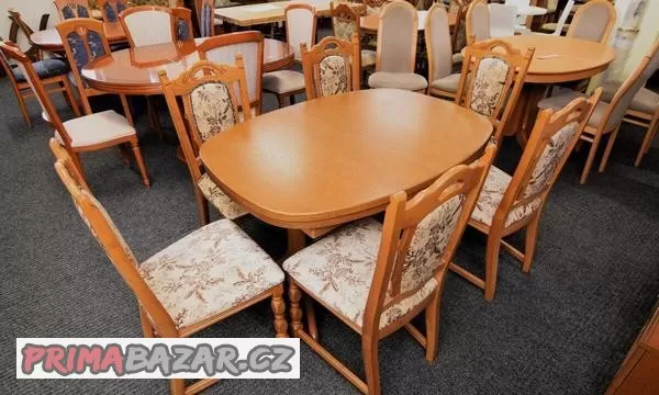 Rozkládací jídelní stůl na dvě délky a 6 židlí.