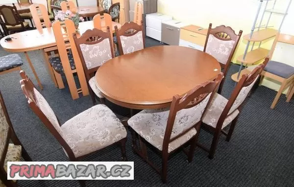 Rustikální rozkládací jídelní stůl a 6 židlí.