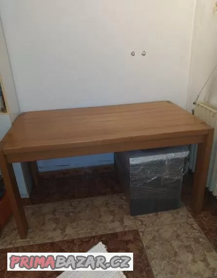 Prodám jídelní stůl z masivu; délka 140 cm, šířka 80 cm, výška 73 cm. Ke stolu jsou 4 židle z masivu.