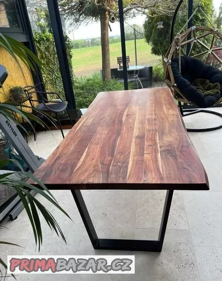 Prodám jídelní stůl, deska masív, exotické dřevo palisandr, kovové černé podnoží. Rozměry 200x90cm. Původní cena 18000.-