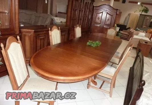 Jídelní stůl rozkládací + 6 židlí, velmi pěkný stav. Rozměry: nerozložená deska stolu 150 x 100/V-77cm + 4x přídavné desky po 50cm.