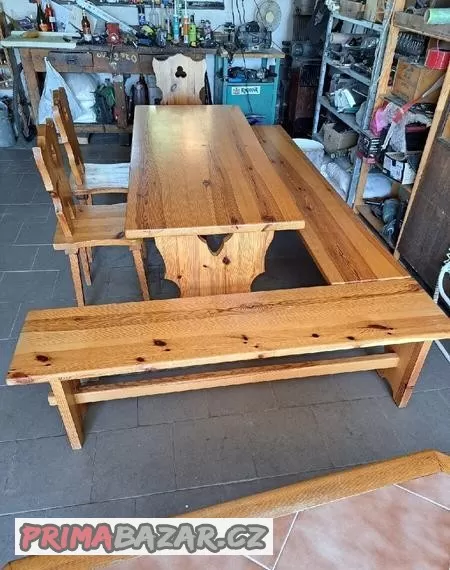 Prodám jídelní stůl 70x165 cm, síla desky 4 cm, 2 lavice 36x160 a 36x220 cm, síla 3,5 cm a 3 židle. Poctivá ruční práce. Materiál borovice.