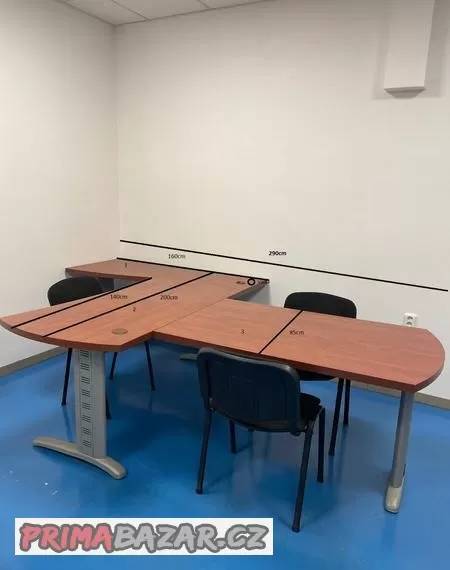 Prodám kancelářský stůl vyrobený na zakázku. Délka 290 cm x šířka 200cm. Stůl má mírné poškození cca 3cm (viz foto), židle nejsou součástí prodeje. Část 1 na obrázku lze použít k části stolu 2 i z druhé strany. Cena 6999,-