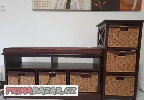 Prodám komodu a lavici s proutěnými košíky (Jysk) v hnědé barvě. Vše velmi zachovalé (jeden flíček na polstru lavice zespodu a menší škrábanec - lze zatřít), jinak bez poškození (v poličce lavice jen smetí - vypadá jako poškrábané). Rozměry viz. foto.