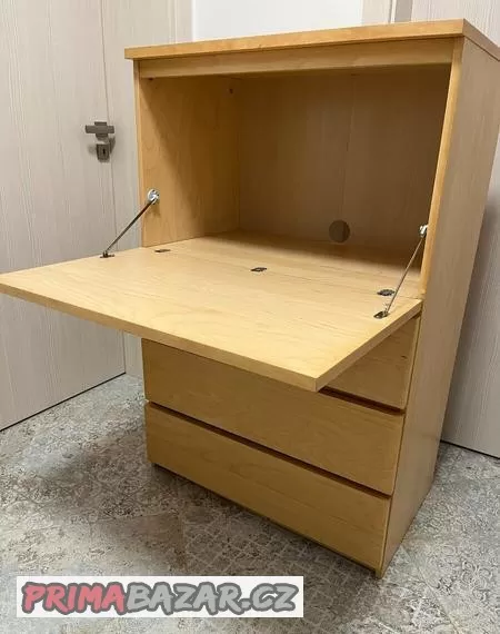 Prodám komoda MALM IKEA, cena je za komodu 899Kč, zlatá samolepka lze snadno sundat, k předání Praha výška 123 x šířka 80 x hloubka 48, u země lehce poškozená (téměř není vidět), rychlost= sleva