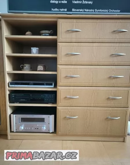 Prodám komodu se zásuvkami a poličkami. Odstín světlý dub.