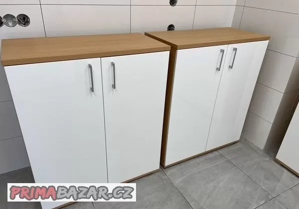 Poslouží v kanceláři i domácnosti. Dekor je buk v kombinaci s bílými fronty ve vysokém lesku. Dvířka jsou lakované vč. hran a mají tlumené dorazy.
