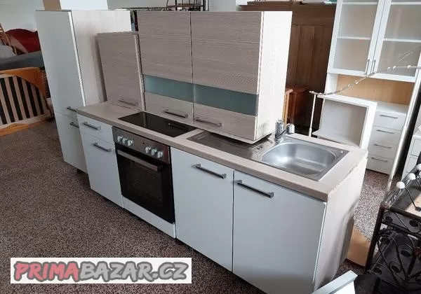 Celkově velmi zachovalá, drobné vady - odřené dvířka u chytu velké skříně, naražený roh dvířek pod dřezem, na velké části dvířek kuchyně jsou ještě ochranné fólie (tyto je možné sejmout)