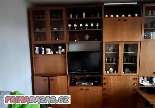 Prodám zachovalou obývací stěnu. Skládá se ze 4 prosklených skříněk, 3 otevřených policových, 5 uzaviratelných a 2 šuplikových viz foto.