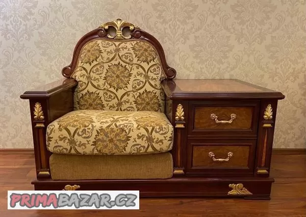 Vyřezávané křeslo se stolkem vhodné například do vstupní chodby (telefonní křeslo). Rozměry 1265 x 670 x 990. Výprodej z expozice s 50% slevou. Cena nyní 19972,- Kč.