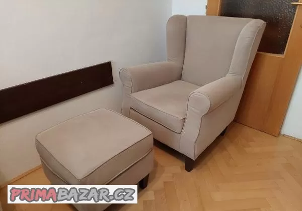 Prodám toto krásné a pohodlné křeslo včetně podnožky. Stav velmi pěkný viz foto. Tkanina na taburetu je lehce okopaná, ale to by šlo určitě kartáčem v pohodě vyčistit. Ke křeslu je i ochranný potah -"kožešina".