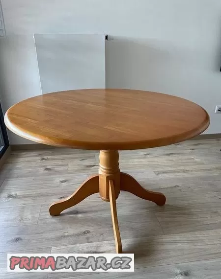 Kruhový dřevěný stůl z masivu, průměr 110 cm, lakovaný povrch.